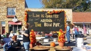 Early Saturday morning the fires are lit under about 30-40 large antique cast iron pots loaded down with 2,000 lbs. of Great Value pinto beans on the north and west sides of the court square. The cooking teams sometimes dress as clowns or ghouls to compete for the title of Best Beans. At the noon dinner bell, cups of beans are served with cornbread and onion, all for free.