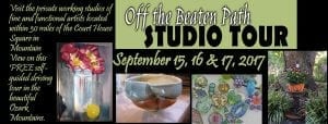 The Off the Beaten Path Studio Tour is a free self-guided driving tour of the private working studios of artists located within 30 miles of the historic Court House square in Mountain View, Arkansas.Now in its 16th year, the tour will take place on September 15, 16 and 17, 2017. On this special weekend over 30 artists in 27 studios will open their private studios to the public for an up-close and personal look at how and where they create their distinctive pottery, jewelry, painting, photographs, wood, furniture, baskets, and much more. Visitors will have the opportunity to visit with the artists, see the work in progress, and purchase locally produced art and crafts directly from the creators. Studios will be open from 9 a.m. to 6 p.m. on Friday and Saturday and from 10 a.m. to 4 p.m. on Sunday.