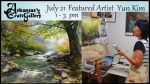 Artist Yun Kim will be in the Arkansas Craft Gallery between 1 and 3 Saturday, July 21, demonstrating her expressive style of painting using exuberant color on canvas. Kim enjoys working in several different media – acrylic, oil, watercolor, pastel, collage, and charcoal. Her subjects include people, animals, waterfalls, creeks and landscapes, however, any subject can be captured by her eye for color and detail. She uses her own photos as subject matter, then returns to her studio to work.  It’s a converted garage, a space to inspire her creativity.  Working while listening to music, she says, “Painting helps to soothe my soul.”  Her ability to capture movement in her brushwork is evident in her waterfalls, creeks, and the manes and tails of galloping horses.  She works realistically, but her brushwork is loose and impressionistic, capturing the fleeting aspect of changing light.