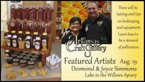 Meet Joyce and Desmond Simmons, owners of Lake in the Willows Apiary, located in Scott, Arkansas. This is a chance to taste a sample of their delicious honey products.They will have a model beehive and a video that explains their harvest methods and their commitment to saving bees from extinction. If you’ve ever wondered about beekeeping and the harvesting of honey, come in and talk to Joyce and Desmond.The Arkansas Craft Gallery is run by The Arkansas Craft Guild, and has been promoting handcrafted in Arkansas since 1962.