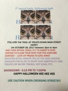 Follow the trail of treats down Main Street Hardy  3 pm-4 pm.  Lots of prizes, check in for $1.00 to enjoy the hospitality and treats (or maybe tricks), hot dogs, etc.  (USE CAUTION WHEN CROSSING THE STREET)