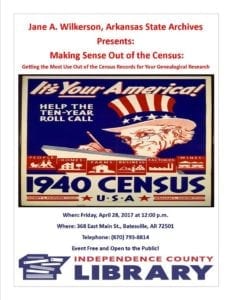 The Independence County Library is continuing their genealogy presentations, this month with Jane Wilkerson with the Arkansas State Archives.  If you have ever wanted to learn how to use census records for your genealogical research, then join Jane Wilkerson at the Independence County Library on Friday, April 28, 2017 at 12:00 p.m. This presentation is free and open to the public.