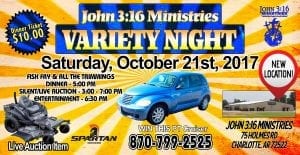 John 3:16 Ministries’ Annual Variety Night Fundraiser on Oct. 21 Changes location to Charlotte at their Multi-Purpose Building (Posted by Ginger Smith)