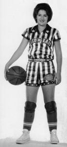 Glenda Ledbetter said that playing basketball was only part of the job. “We were there to entertain, so we had dribbling, ball handling routines, and trick shots such as the Spin Shot, Knee Shot, Head Shot, Flip Shot and a Piggy Back Shot. At halftime, I would do the Dipsy Doodle. Holding the basketball with both hands, I would bend over, throw the ball back through my legs up into the basket.”