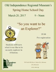 Old Independence Regional Museum will host its spring Home School Day on Monday, March 20, 2017 from 9 a.m. to Noon, with sign-in beginning at 8:45 a.m. Registration and a program fee of $5 are due by March 8, 2017. Registration is limited to 50 students.